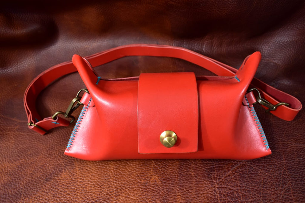Chic red vegetable-tanned leather clutch with contrasting blue stitching. Completely hand stitched using brass alloy hardware for closure. Comes fitted with adjustable crossbody strap. Measurements: 30 x 16 x 8 cm. Handmade ...