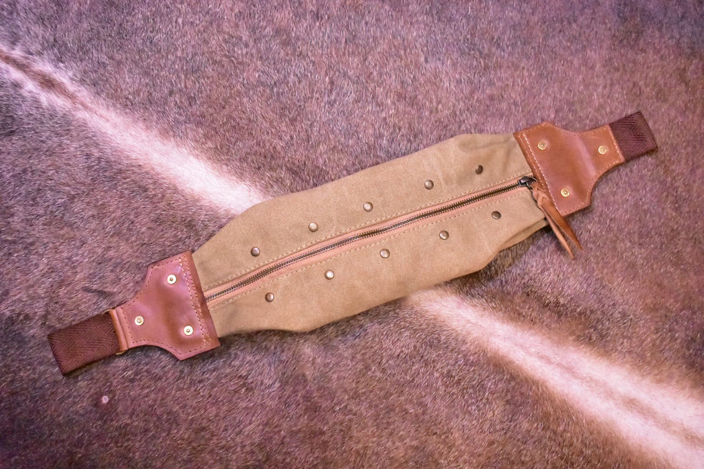 This comfortable body bag combines thick canvas and soft buttery vegetable-tanned leather to create a unique twist on the classic bum bag. Closed with brass rivets and a zipper on front, storage...