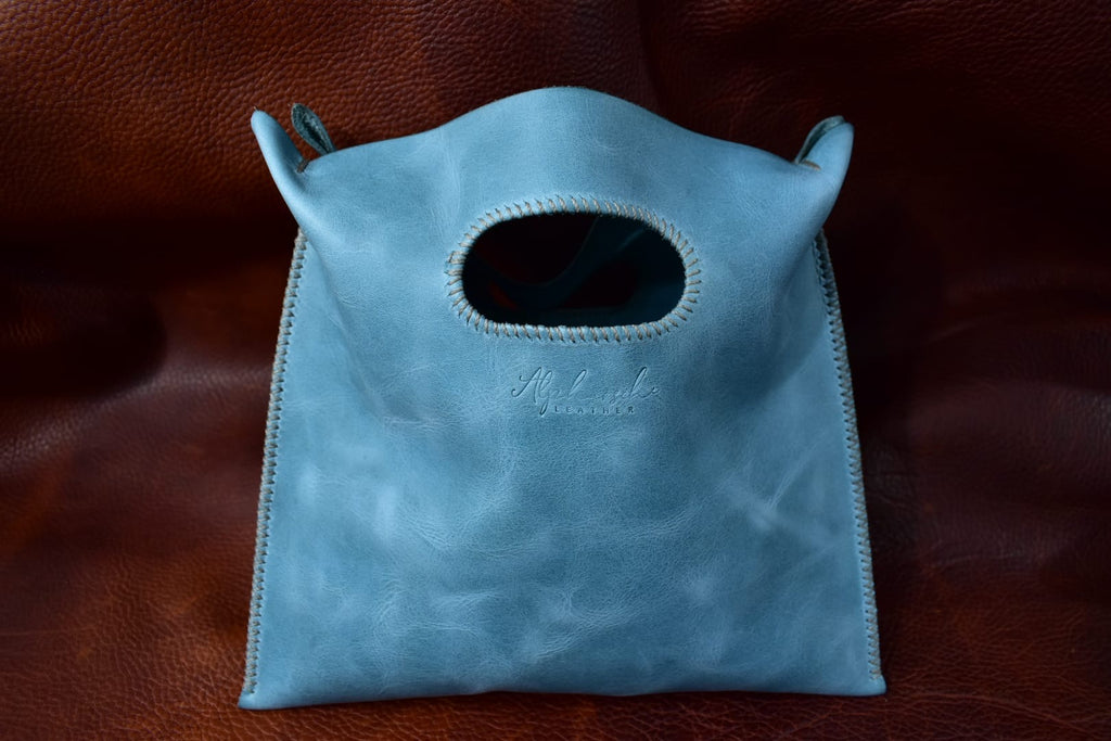 Soft sky blue crazy horse cow leather clutch. Baseball stitched handle for comfortable and easy carry. Completely hand stitched. Stamped with Alpharsche logo. Handmade in Barcelona, Spain